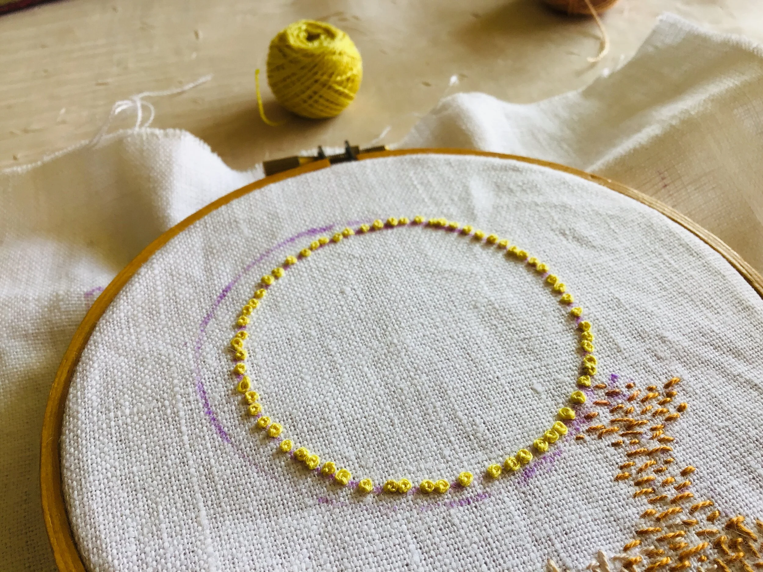I used a template to create oval shapes that burst outward from the center. Then I filled in the spaces between the ovals with golden seed stitch, gradually transitioning to green as the yellow flowers faded and green leaves replaced them.